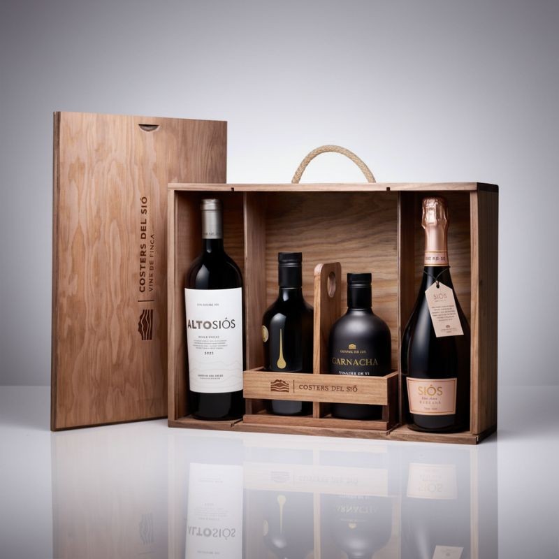 Lote de vinos para regalar compuesto de 2 botellas de vino, botella de aceite de oliva virgen extra y vinagre de vino todo en caja de madera con el logotipo de la bodega.